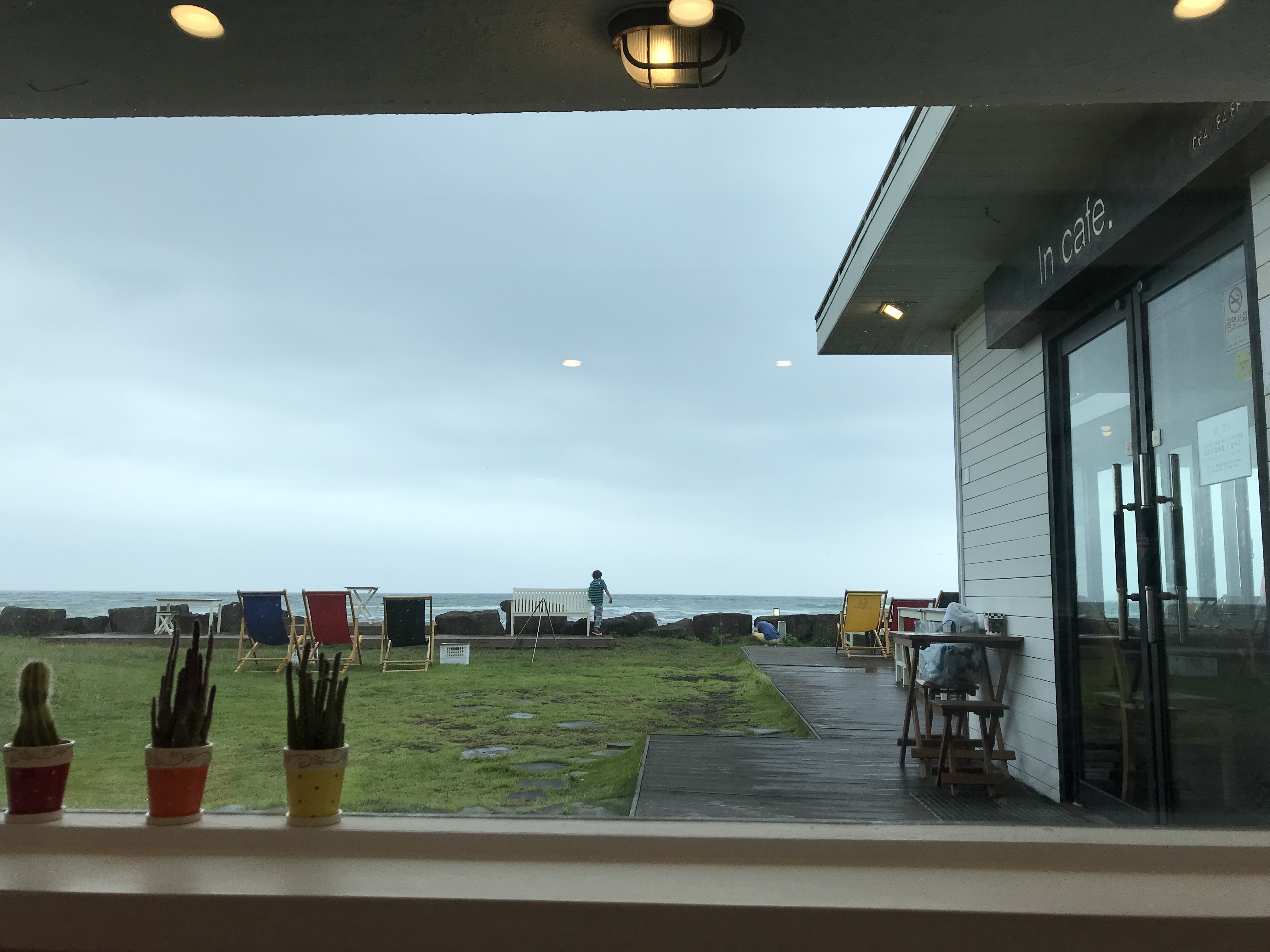 이 카페는 자그마치... '제주 아이와 카페'로 검색해서 찾은 카페다. 그 중 카페에서 바다가 보이면서도 해변으로 바로 내려갈 수 있어서 어른은 쉬고 아이는 지겹지 않은 그런 곳!!! 다행히(?) 비가 와서 사람이 붐비지 않았고 육지보다 비싼 가격이었지만 자리가 자리인 만큼 허니버터브레드와 차와 사과쥬스를 먹었다. 그런데 여기서 오늘의 깨달음. 나는 위험회피 성향이 강한 사람이어서 마음놓고 쉴 수가 없었다. 아이들이 혹시 문에 손이 끼이지 않을까, 돌에서 넘어지지 않을까 등등 계속 조마조마....... 나는 어쩌자고 이렇게 피곤한 사람인건가. 이렇게 또 자기성찰의 섬에서 하나를 깨닫는다.