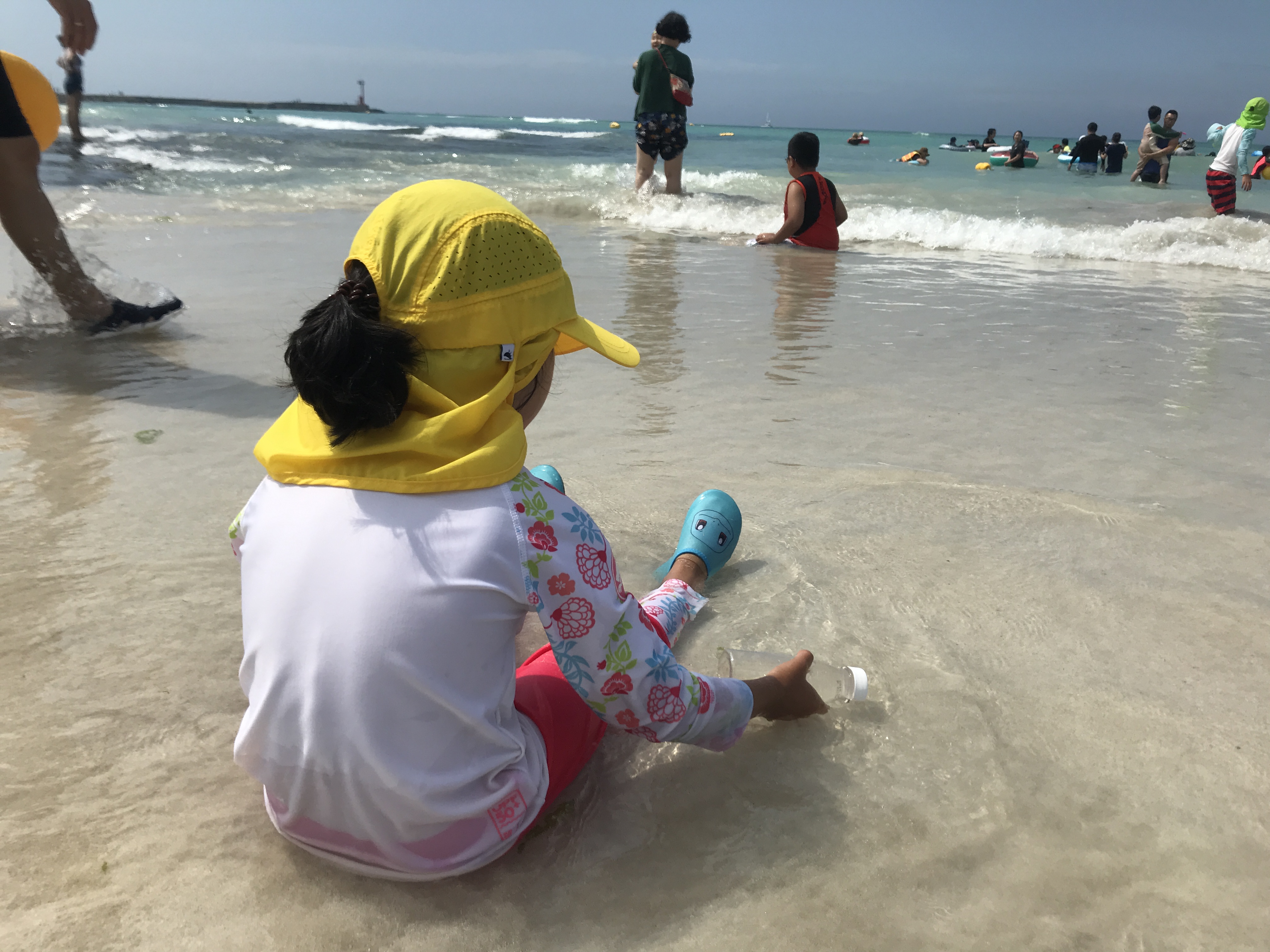 하도바다에서 조개잡고 놀고 싶었지만 비가 갑자기 많이 내려서 월정리로 갔다. 월정바다는 맑고 모래사장도 깨끗하고(처음으로 미역이 없는 바다였음) 좋았지만 젊은이들이 많아 여기저기서 시끄럽게 음악이 들렸고(게다가 내가 싫어하는 최신댄스곡과 EDM...) 발만 씻는데도 500원을 받는 야박한 곳이었다. 아이들과는 물놀이를 하러 다신 오지 않을 곳. 그럼에도 불구하고 우리집 녀석들은 아주 즐겁게 물놀이를 했다. 둘째가 잠시 해파리에 쏘이는 사건이 있었지만 다행히 가라앉았다.