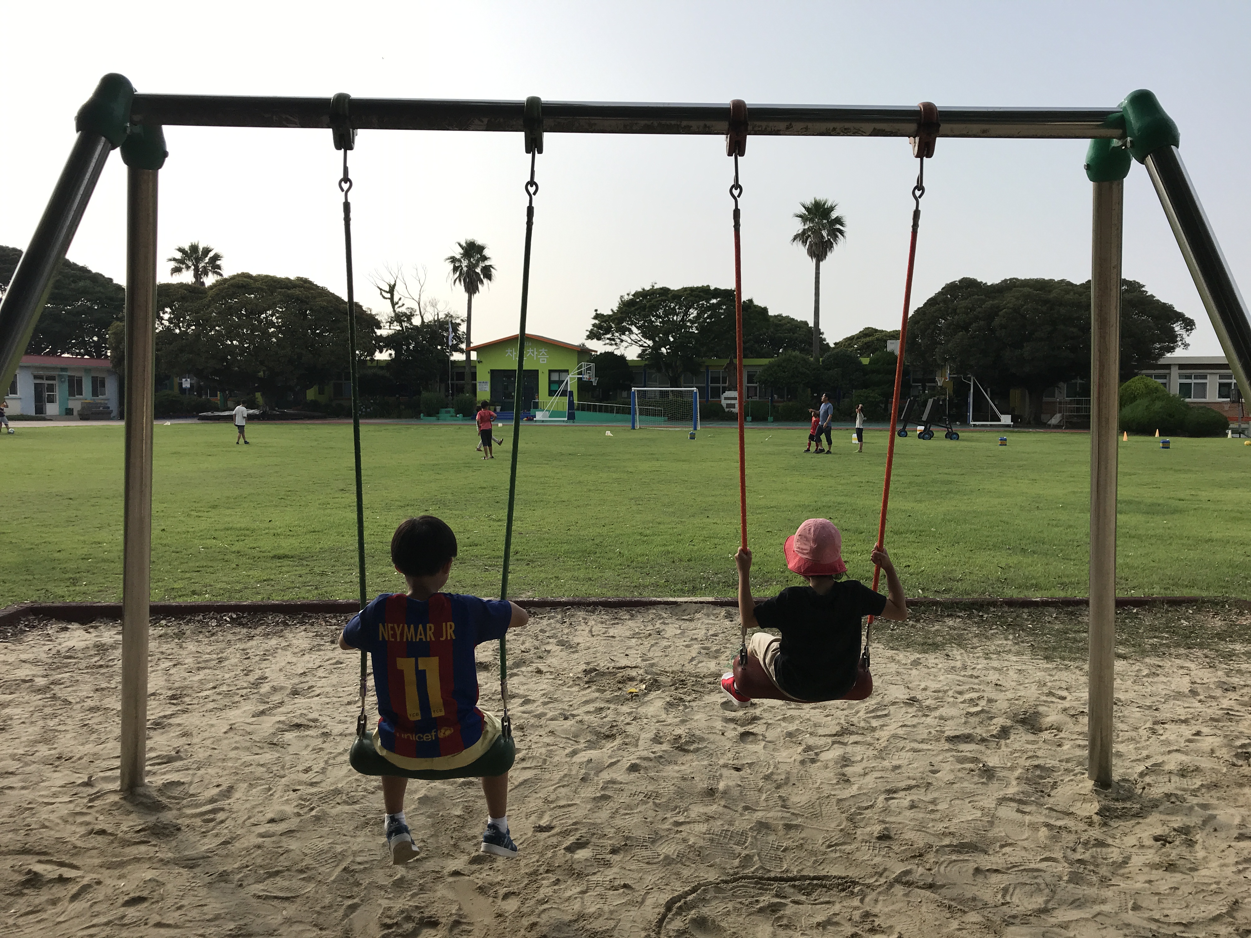 저녁무렵 간식 먹고 우리 셋이 슬슬 나들이한 곳은 선흘분교. 무척 예쁘다는 제보를 어젯밤에 받았던지라 슬슬 가봤다. 정말 마을 안쪽 깊숙히 있는 작은 학교였는데 사진으로 본 것 보다 아기자기하고 정말 이 학교에 보내고 싶을 만큼 좋았다. 우리집 녀석들도 시소, 그네, 정글짐, 구름사다리, 미끄럼틀 등 학교라면 어디든 있는 시설들을 이용하며 즐거워했고(ㅋㅋㅋ), 잔디구장과 달리기 트랙에서도 놀았다. 뒷편 텃밭도 구경하고 오리, 토끼등 키우는 동물들도 구경했다.