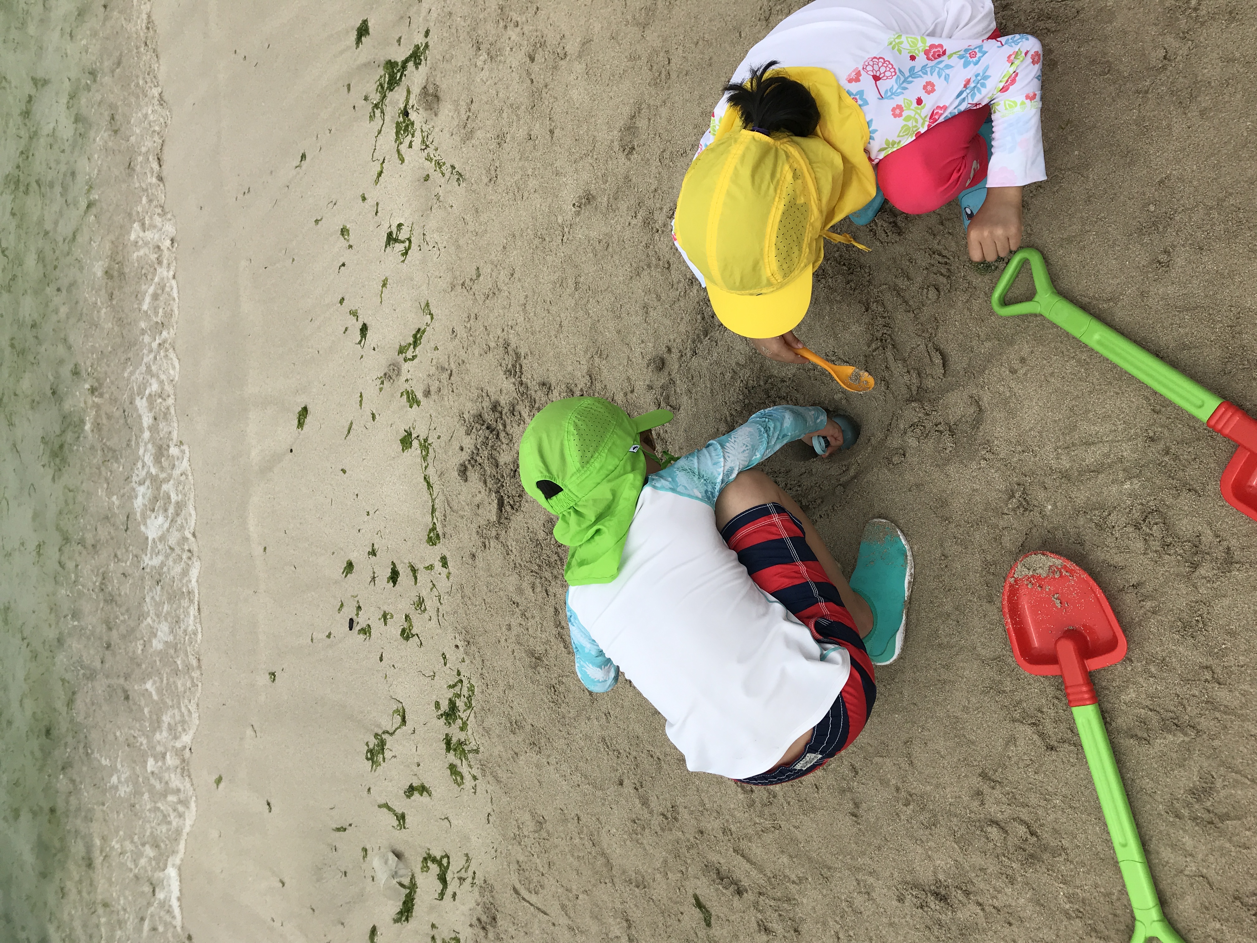 너무 지루해서 바다로 나갔다. 둘째도 따라오고 우리 둘이 재미나게 노는 것 같아보이니 첫째도 따라온다. 수영복을 입고 나서긴 했지만 해수욕 마무리를 시킬 생각을 하니 아득해져서 나는 허벅지까지만 담갔다. 그런데 이 대범한 녀석들... 엄마를 떠나 멀리멀리 다른 아저씨가 있는 곳까지 걸어간다. 깊이로 따지면 어린이들 허리 정도의 깊이지만 거리로는 아주 멀었는데... 본인들의 모험과 성공이 그렇게 재밌고 신났는지 몇번이고 나한테 왔다가, 멀리 갔다가를 반복한다. '아 아쉽다. 나도 들어가고 싶다... 하지만 나는 미래를 대비하는 사람... 지금만 사는 사람이었으면 내 삶이 더 즐거웠을까...'등을 생각하며 고뇌에 잠겼지만 현실을 직시하고 멀리서 손을 흔들어줬다. (이때는 몰랐는데 고뇌에 잠기는 동안 내 뒷다리는 일광화상...)